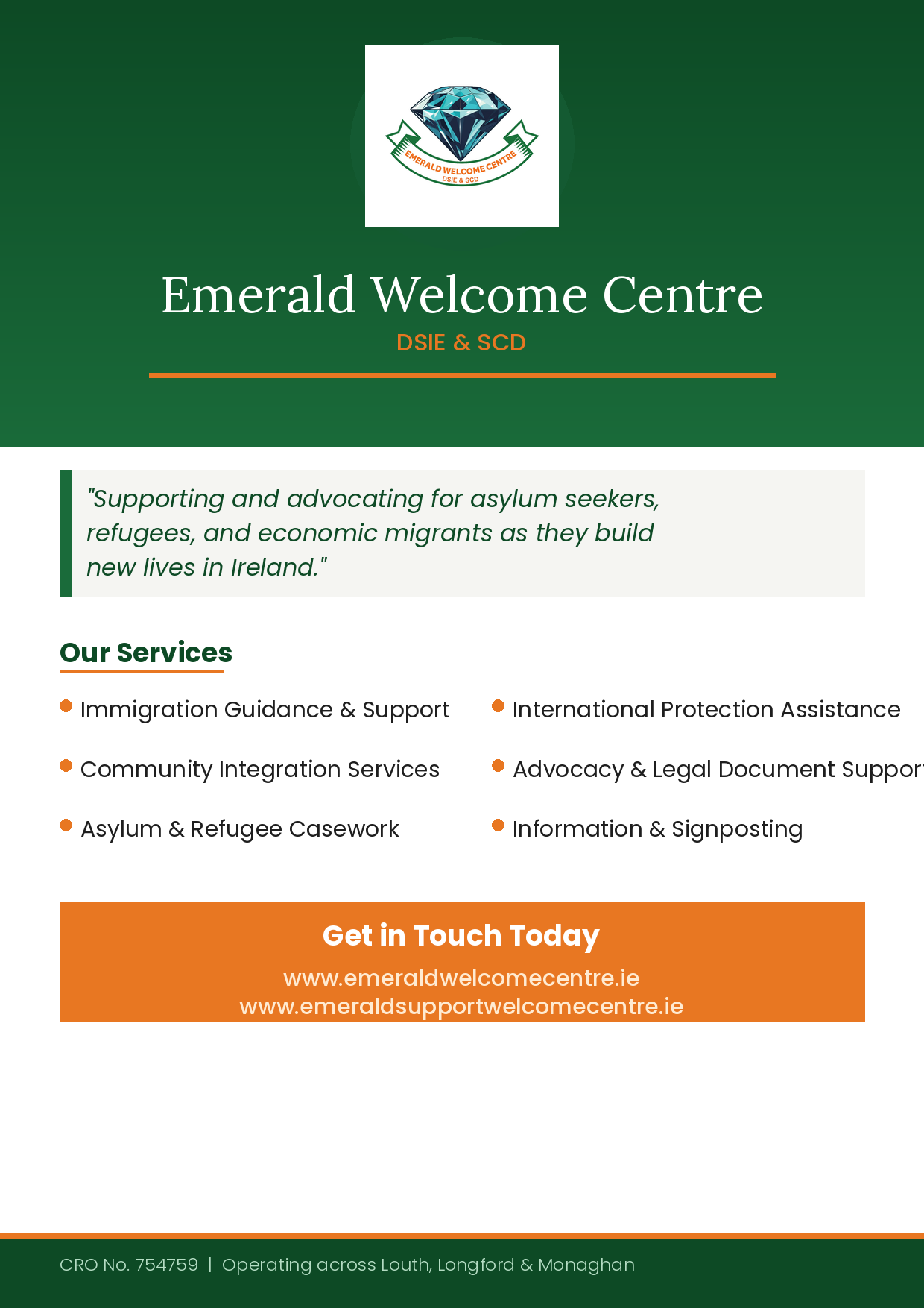Emerald Welcome Centre is dedicated to supporting individuals and organisations through complex legal and integration processes, with a strong focus on dignity, rights and inclusion. The centre provides specialised assistance with legal documentation and advocacy, while fostering a welcoming community space for people from diverse backgrounds.